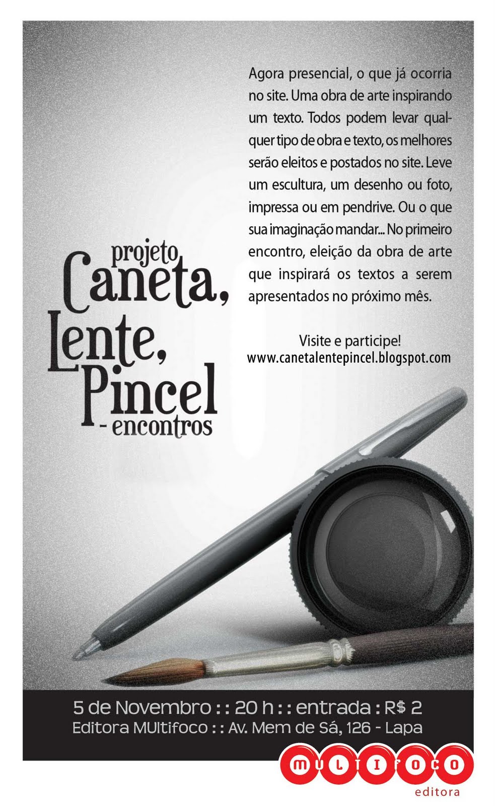 A partir desta quinta-feira, 05/11, às 20:00 h, serão iniciados encontros abertos do Projeto Caneta, Lente & Pincel. Vá e leve uma manifestação artística que possa inspirar um texto.